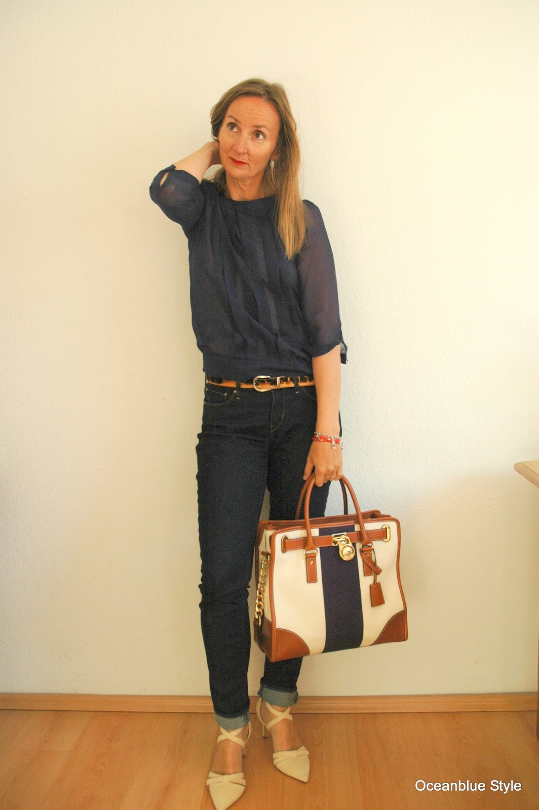 Blau in blau. Die blaue Bluse zur dunklen Levi’s Skinny, in der Variante “bold curve” übrigens. Das macht sie schmal und doch angenehm locker tragbar. Und noch ein Geheimnis verraten: Was ist das Schöne an der Bluse?